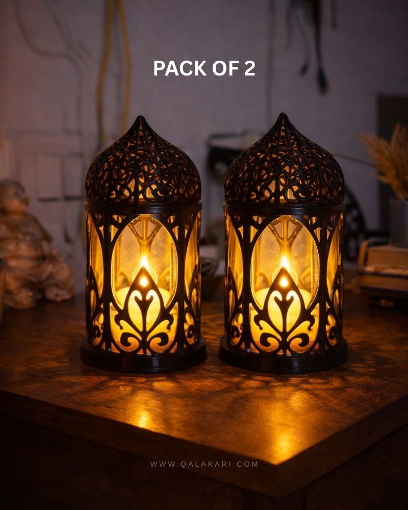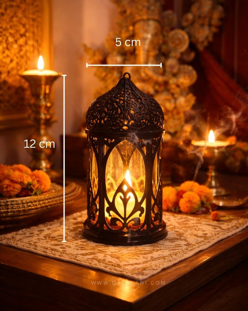 Decorative Moroccan-style lantern featuring a warm LED tealight that creates a soft, cozy glow—safe, flameless, and perfect for home décor, festivals, and gifting.